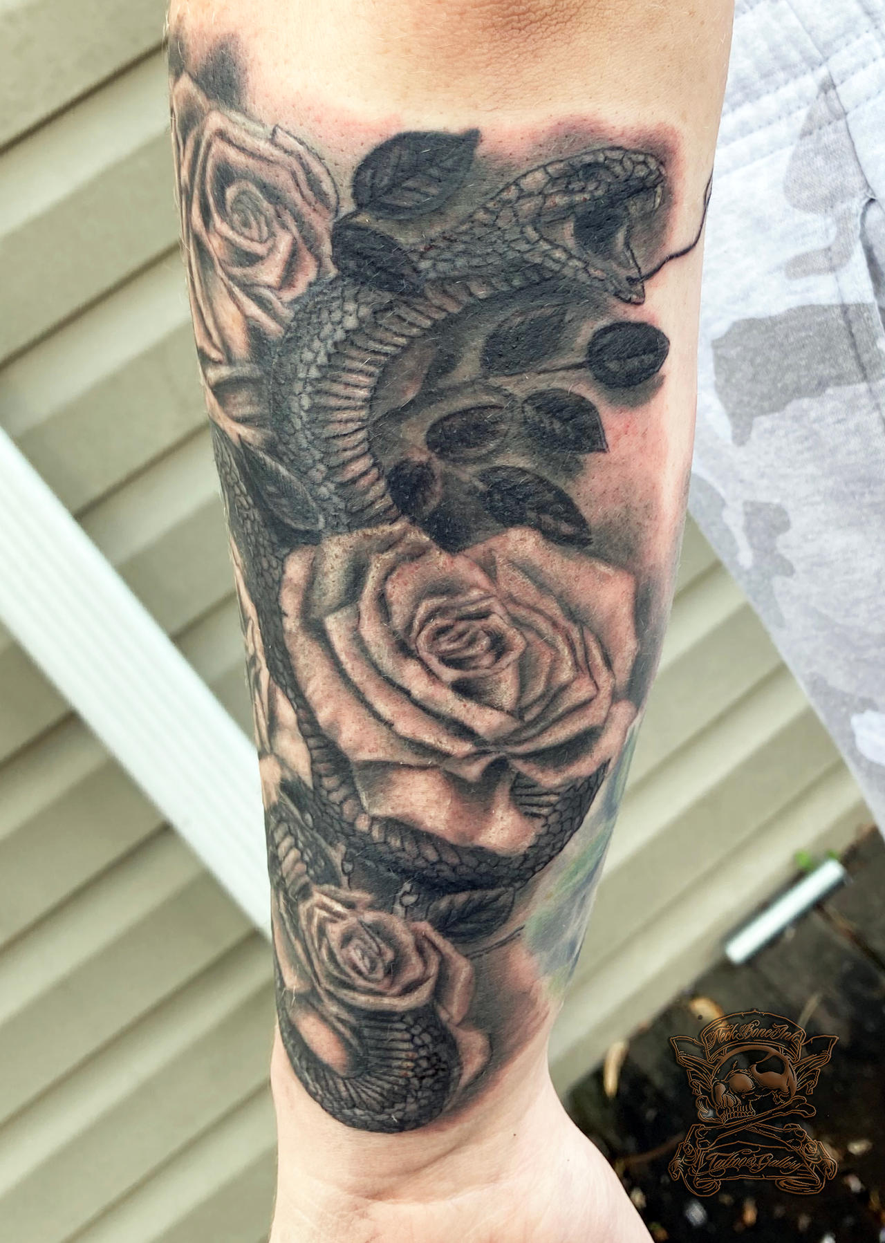 Black And Grey Snake With Roses Tattoo Design By A T G 4